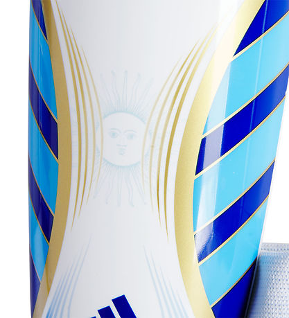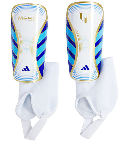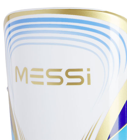 Cool adidas Performance shin pads in white with blue stripes, gold details and Messi and adidas Performance logos.