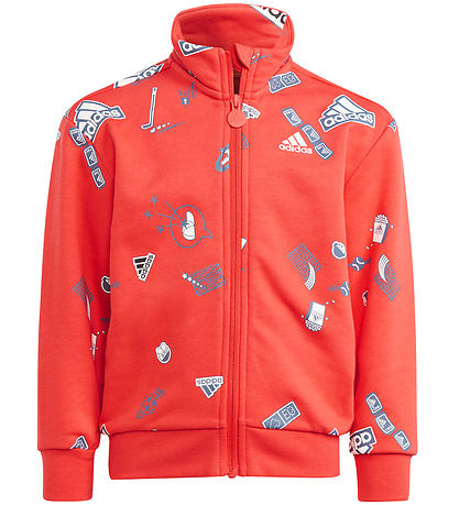 - The Cardigan is red, with an all-over-print of the logo and various sports motifs in navy, white and black.