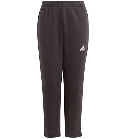 - The sweatpants are plain black, with an embroidered logo in white on the left thigh.