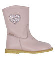fine Anguglu winter boots in pink leather, with a heart in pink glitter on the outside of the shaft.
