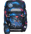 On each side, the school backpack has a large compartment which closes with a zipper, and here there is e.g. space for a water bottle. On the front, the school backpack has a smaller compartment that closes with a zipper, and in this there are two small pockets and a keychain that can be clicked off with a buckle.