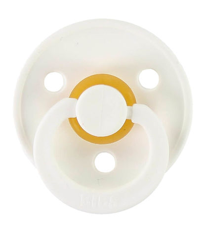 The BIBS pacifier has a round shape made of natural rubber. The pacifier's shield has a round and outward-facing shape with practical air holes, so that you avoid the kid's skin being bothered by the moist environment, while also preventing a vacuum from forming between the pacifier and the skin.