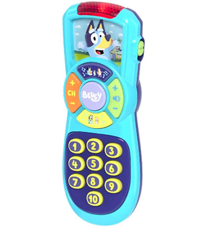 Colourful Bluey toy remote control in a bright blue colour. It has a fun design with numbers and buttons in many colours, as well as the Bluey character presented on the front. The toy remote control can make sounds and light.
