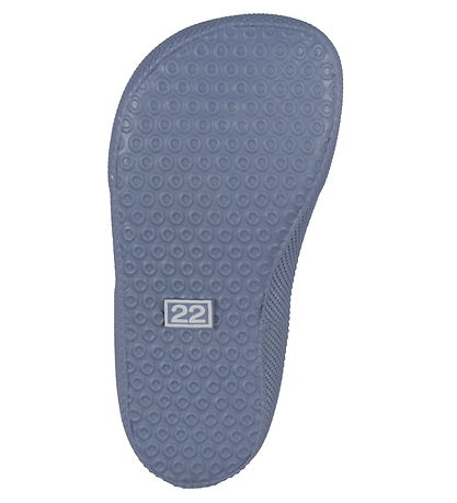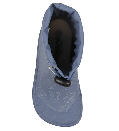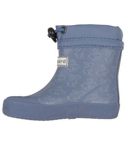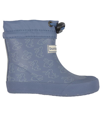 Fine Bundgaard rubber boots in blue with an allover print of rabbits and a white logo on the front.