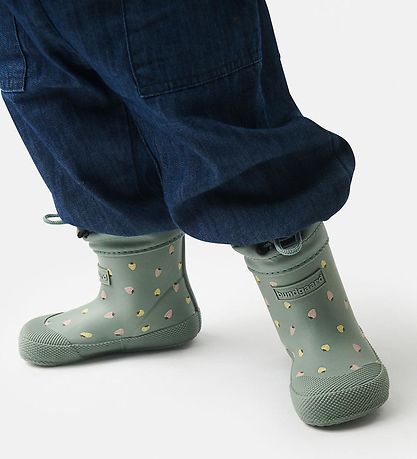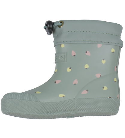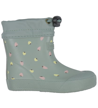 Fine Bundgaard rubber boots in dusty green with an allover print of small strawberry in pink and yellow. On the front there is a discreet logo and on the back there is a practical reflective stripe.