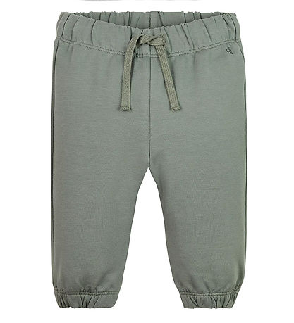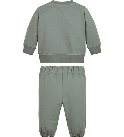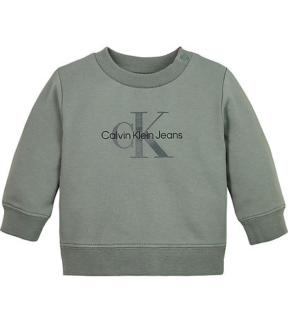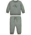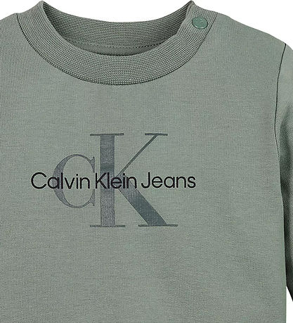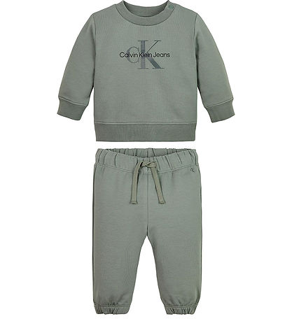 Smart Calvin Klein sweat set, consisting of a sweatshirt and a pair of sweatpants, both parts in dusty green. The Sweatshirt has the brand's name and logo printed in grey and black on the chest. The sweatpants have the brand's logo printed in grey at the top of the left side at the front.
