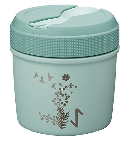 Fine Carl Oscar thermo lunchbox in green stainless steel with print of flowers and birds on one side in silver.