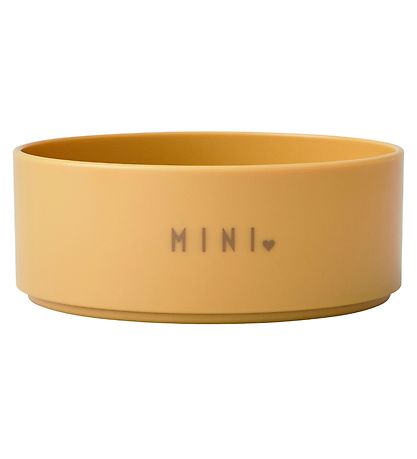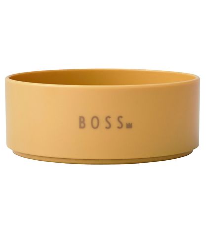 Practical Design Letters bowl in mustard with "Mini" and a heart on one side and "Boss" and a crown on the other.