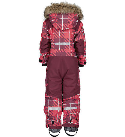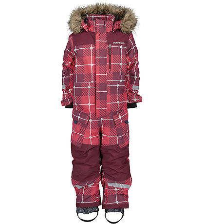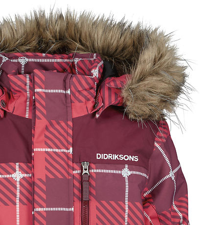 Nice Didriksons snowsuit in red with an upper part in a forest manstern design in shades of red and grey. The Snowsuit has logos and reflective print.