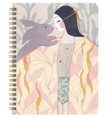 Beautiful Djeco notebook in pink, with a woman and a rabbit in front with details in gold.