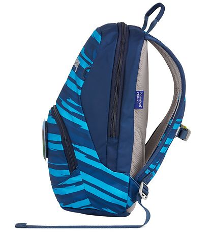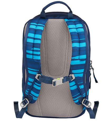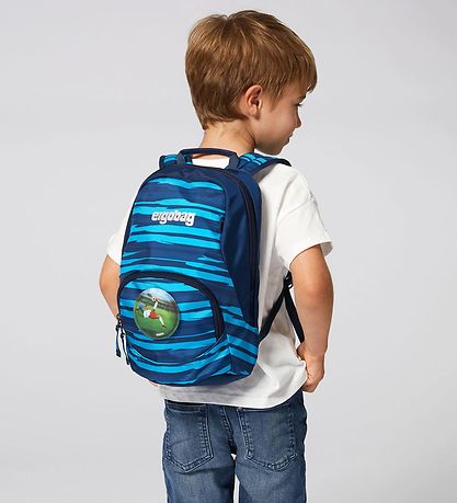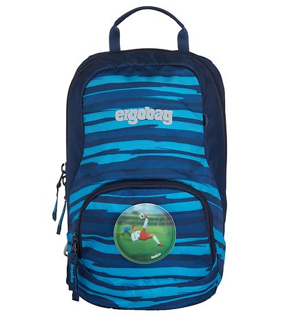 Smart Ergobag preschool backpack with a striped pattern in shades of blue and turquoise. A velcro patch with a motif of a football player is included.