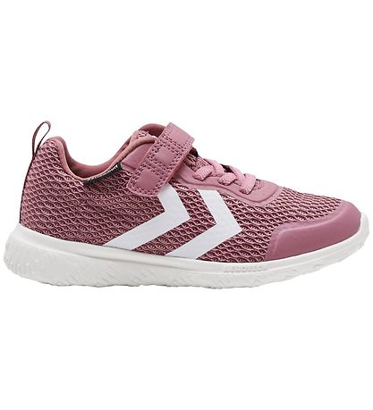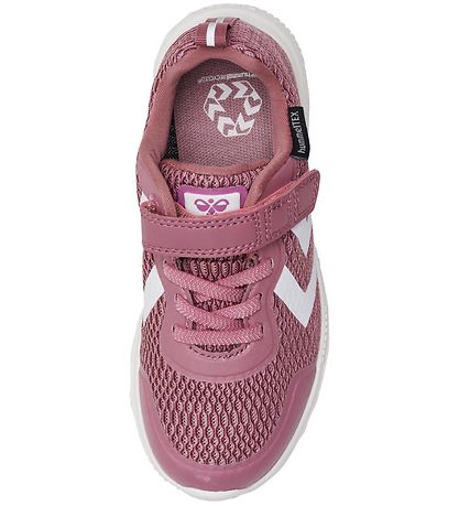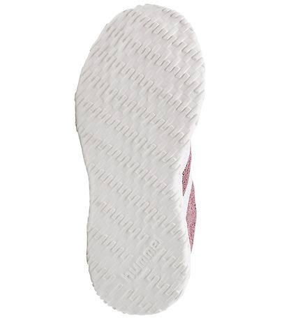 Nice Hummel sneakers in pink mesh and rubber coverings. On the outer and inside, the characteristic shevrons are in white. At the top of the tongue is a white sticker with the Hummels logo in pink. The outsole is white.
