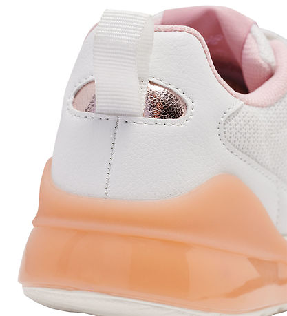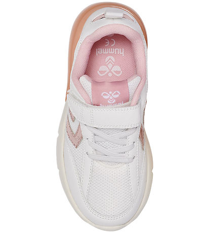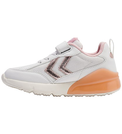 Smart Hummel shoes in white mesh and faux suede with Hummel shevrons on the sides in metallic pink. The shoes have a pink detail at the heel with built-in LED light, which is activated when the kid walks and runs.