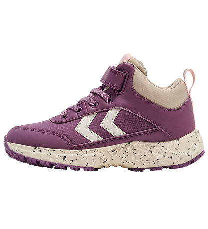 Stylish Hummel boots in purple textile and imitation leather with pink details. The Boots have reflective details and white Hummel shevrons. The outsoles are white with decorative, black splashes.