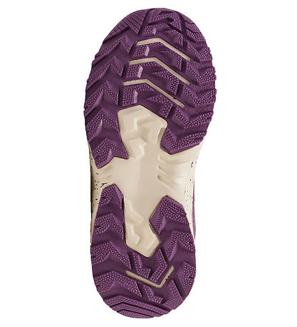 The Hummel boots are a low model that goes up to the ankles. They have elastic laces over the instep and they close with a Velcro strap. The Boots have textile on the inside and they have removable insoles. There are strong outsoles in lightweight EVA with black dots. On the underside they are made of purple rubber, which provides good foothold.