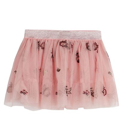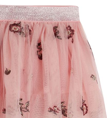 Fine Hust and Claire skirt in pink tulle with embroidered flowers and an elastic edge in silver glitter.