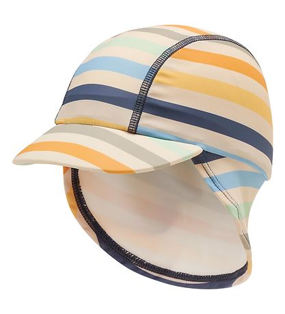 Cool Hust and Claire swim hat in beige with horizontal multicolored stripes.