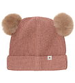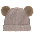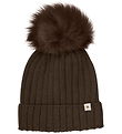 Charming Huttelihut beanie in navy with a large, soft pom-pom in a light brown colour on top.