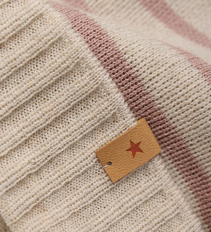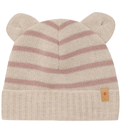 Beautiful Huttelihut beanie with fine stripes in cream and pink, which gives a sweet and soft look. The Beanie has small, cute bear ears on the top, giving it a playful and charming design that is perfect for the little ones.