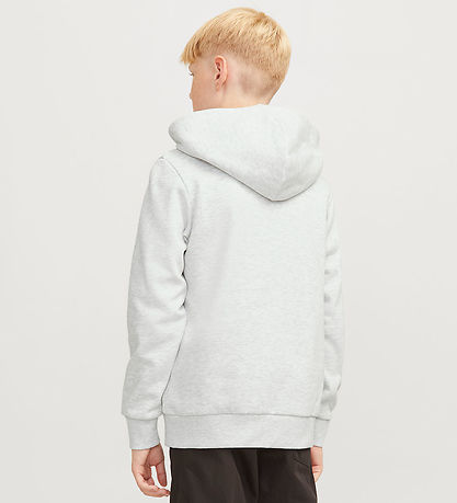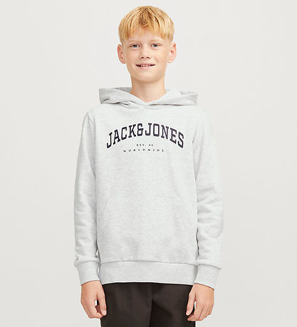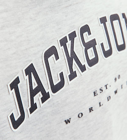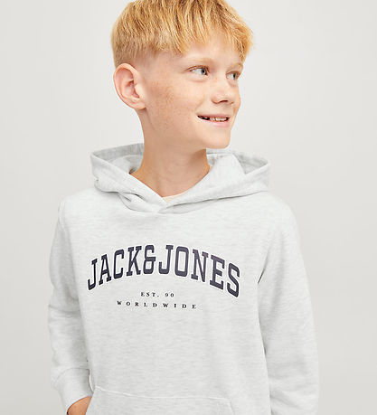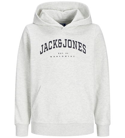 Elegant hoodie from Jack & Jones in a melange light grey with a large logo print on the chest of the text "Jack & Jones EST. 90 Worldwide".