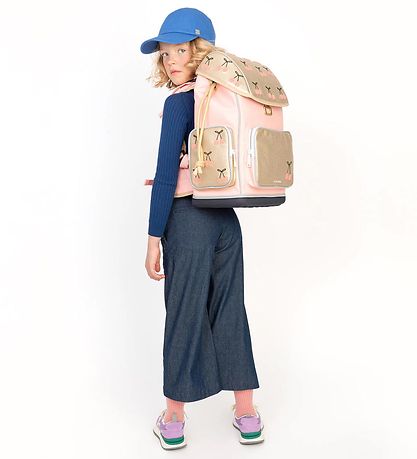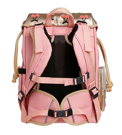 Nice Jeune Premier school backpack in pink, with flap and pockets in gold glitter. On the front and flap there are cherries in pink and black terrycloth. The zips and pendants are in grey and white, and there are reflective piping on all sides. Some edges have a faint glitter.