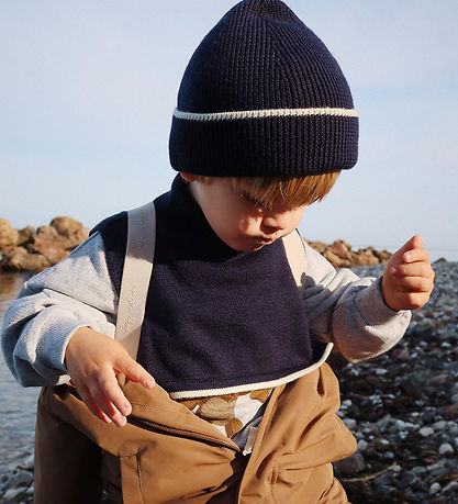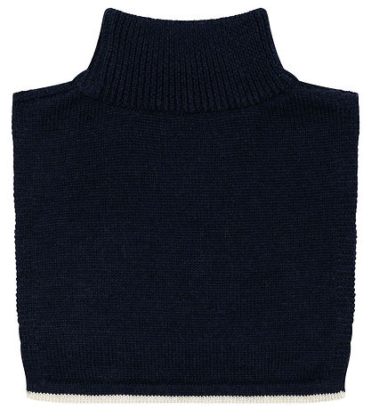 Practical Konges Sløjd neck warmer in classic navy knitted with fine, white stripes at the bottom.