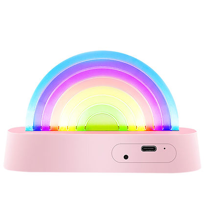 Beautiful Lalarma lamp shaped like a colourful rainbow in eight shades and with a pink base.