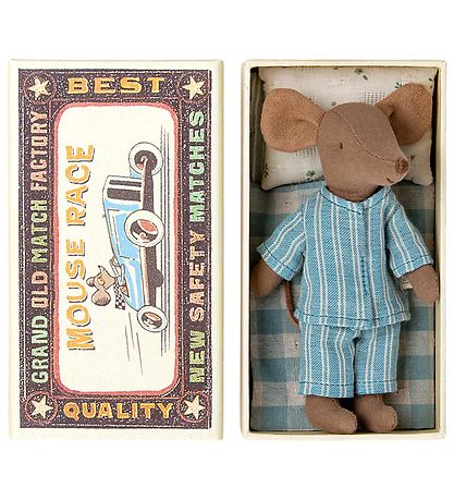 Maileg the soft toy is the big brother of the mouse family. The Soft toy comes in a nice box, which looks like a matchbox, and it lies on a soft mattress and a nice cushion with a nice blanket over it.
