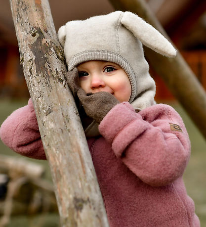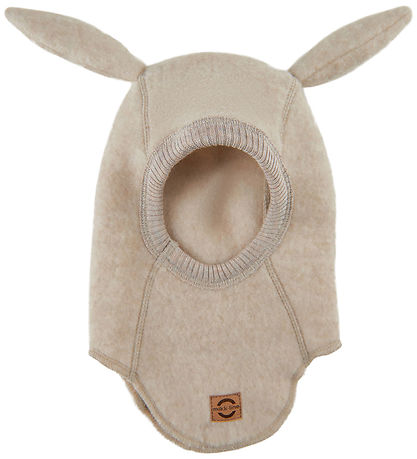 Fine Mikk-Line balaclava of felted wool in melange cream white. The Balaclava has cute bunny ears on top, and under the chin there is a brown leather tag with a Mikk-Line logo.