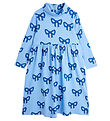 Elegant Mini Rodini dress with brown and blue stripes. The Dress has long sleeves and a round neckline. The Mini Rodini dress is adorned with a decorative bird embroidery at the front, which adds a unique touch.