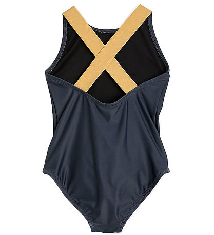 The Mini Rodini swimsuit has wide, brown elastic straps over the shoulders that crosses over the back. It has narrow elastic edges in all openings, which provide a good and comfortable fit.