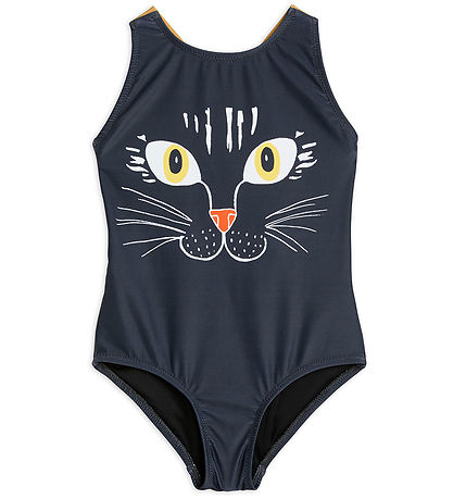 Nice Mini Rodini swimsuit in black with a big, friendly cat face.