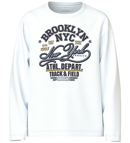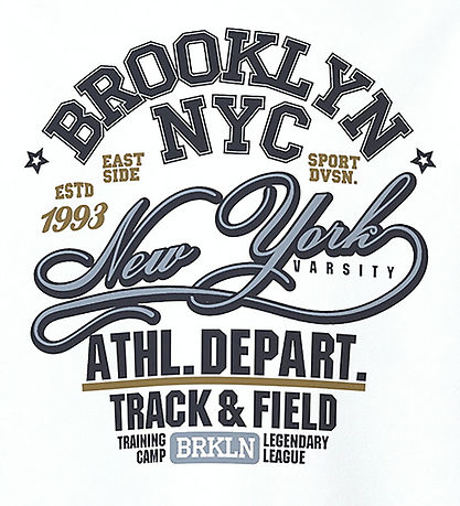 Stylish blouse from Name It in white with a large, distinctive print on the front of the text "Brooklyn NYC" and "New York Varsity" in different fonts. The print also includes words like "ATHL. DEPART." and "TRACK & FIELD" as well as the year 1993.