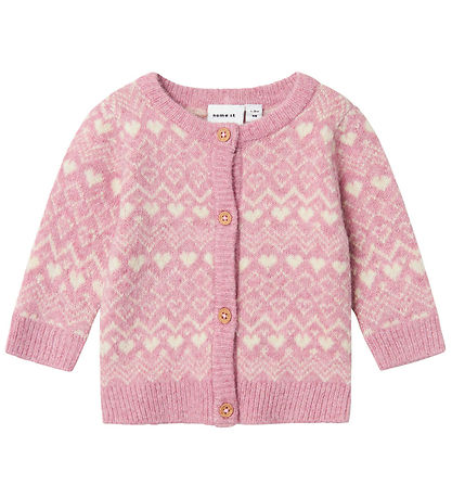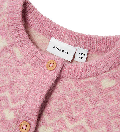 Beautiful Name It cardigan in a light rose shade with a fine heart and zigzag print. The Cardigan has long sleeves and buttons at the front, adding a decorative touch to the cute design.