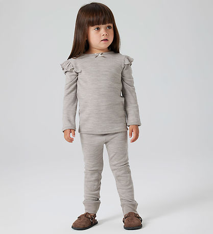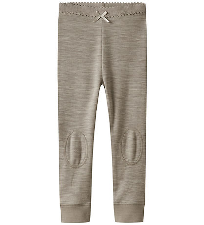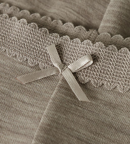 Gorgeous Name It leggings in melange grey brown with a decorative bow at the front and stitching on the knees. The Leggings have an elastic with lace at the waist and ribbed edges at the ankles. They are made with merino wool and viscose.