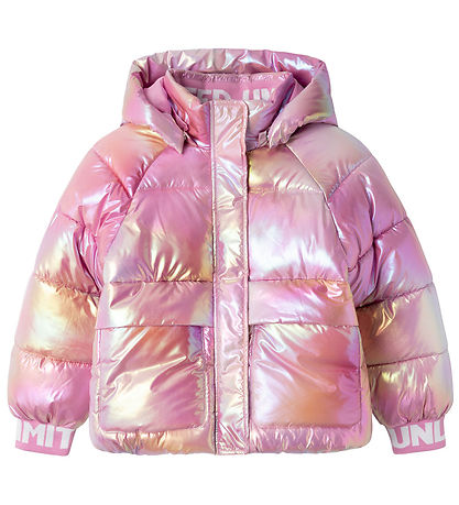 Lovely Name It puffer jacket that shimmers in pink, purple and golden shades. The duvet jacket has horizontal seams and on the ribbed edges it says "Unlimited" in white.