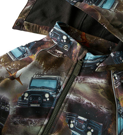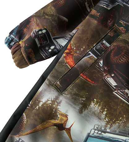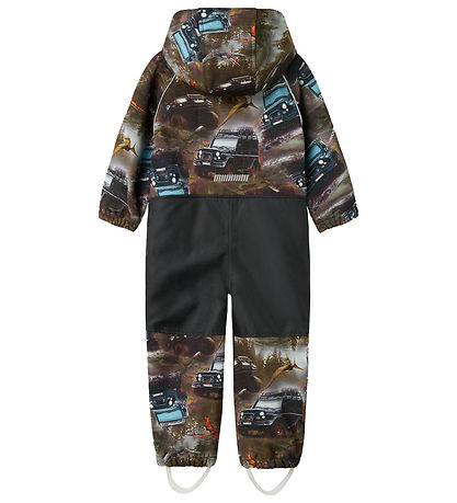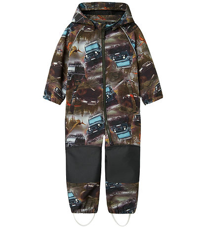 Cool Name It softshell suit with an allover print of jeeps, dinosaurs and others things in the jungle.