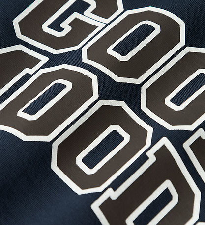 Stylish Name It sweatshirt in a deep navy with the text "Good Moods" in black and white on the chest. The Sweatshirt has decorative stripes in light blue, white and black on the sleeves, which adds a sporty look.