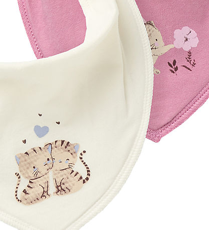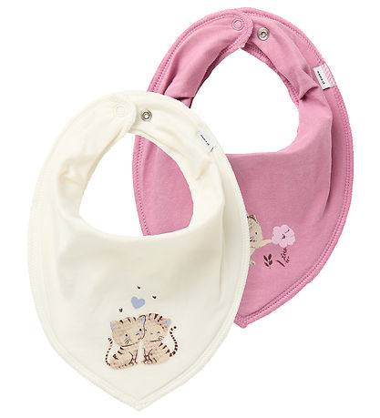 Delicious Name It bibs in a light cream color with a cute cat print on the front and pink, as well as a beautiful pink nuanced teething bib with flower print. Both designs are decorative and practical for everyday use.