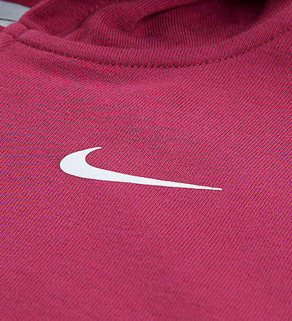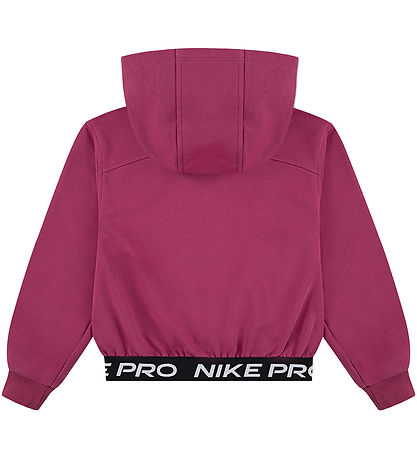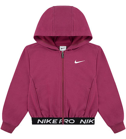 Stylish Nike cardigan in dark pink with a white logo print on the left chest and a black elastic with the text "Nike Pro" in white at the bottom. The Cardigan is made of sweat quality with a soft hood and a full-length zipper. It has long sleeves with ribbed edges at the sleeve openings and practical pockets on the sides.