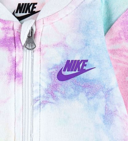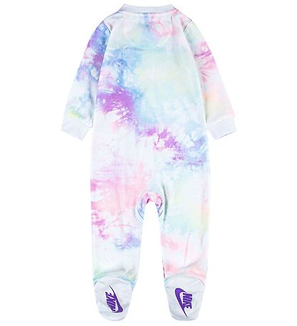 Gorgeous Nike jumpsuit with a batik pattern in pastel shades of green, yellow, purple and pink. The Jumpsuit has a purple Nike logo on the left chest and under the building feet.