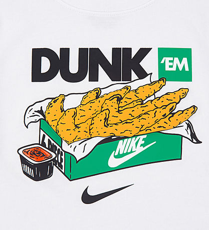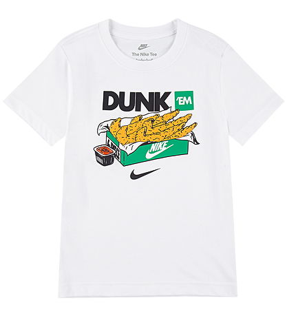 The T-shirt has an eye-catching print with a box that says "Dunk 'Em" above it, and the Nike logo is clearly visible. This unique graphic gives the t-shirt a modern and original look. The T-shirt has a round neckline and short sleeves, making it suitable for many occasions.