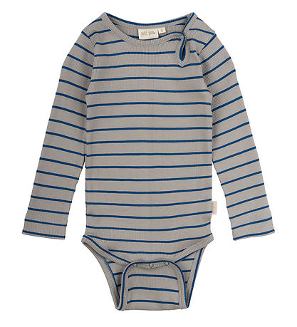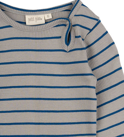 Practical Petit Piao bodysuit with long sleeves in a light grey colour with blue stripes. The Bodysuit has a button closure for easy dressing. Petit Piao ensures comfort all day.