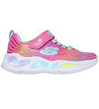 The Skechers shoes have practical elastic shoelaces, and they are adjusted with a wide velcro band across the instep. The Velcro strap also functions as an on/off button for the cool light.