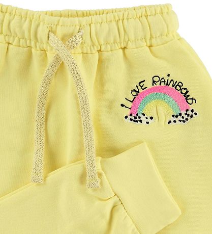 Gorgeous Soft Gallery sweatpants in yellow with an embroidered rainbow in pink, mint and yellow and the text "I love rainbows" in black.