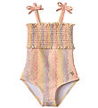 Smart Stella McCartney Kids swimsuit with wide stripes in all the colours of the rainbow.