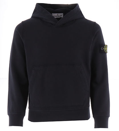 Nice Stone Island hoodie in plain navy sweat, and the iconic logo mark is fixed with buttons at the top of the left sleeve.