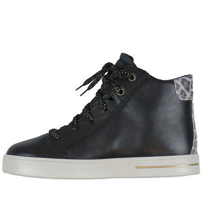 Beautiful Superfit boots in black with leopard print on the heel. The Boots are tightened at the front with black shoelaces with gold glitter and closed with a zipper on the outside. Inside there is black, faux suede on the top and fine fleece on the bottom. They have removable insoles and flexible and lightweight outsoles with a smart pattern under the bottom, which ensures a good foothold.
