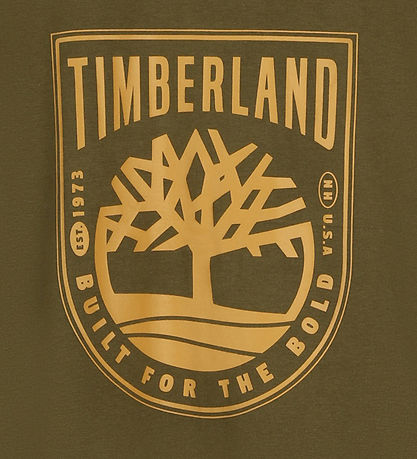 Smart Timberland t-shirt with short sleeves in a nice, olive green colour with a large logo print on the front in yellow.