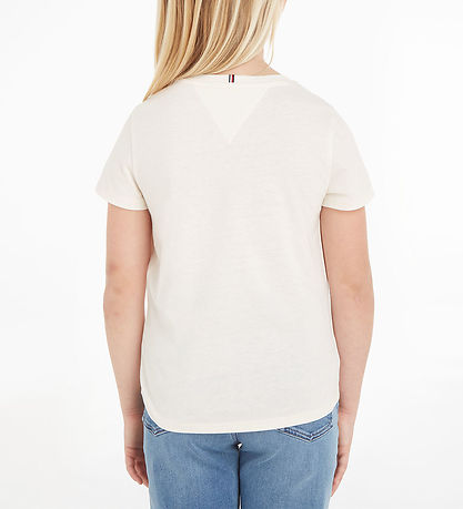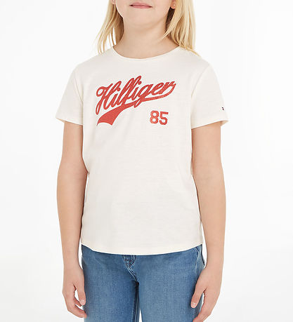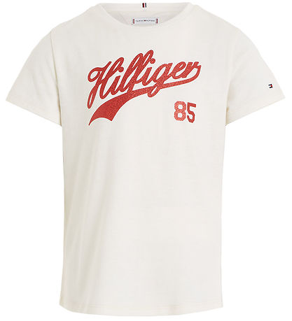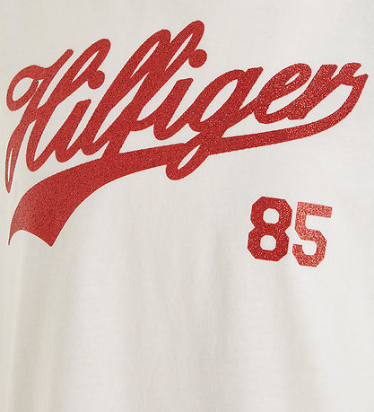 Beautiful Tommy Hilfiger t-shirt in cream white with print of the text "Hilfiger 85" on the front in red glitter.